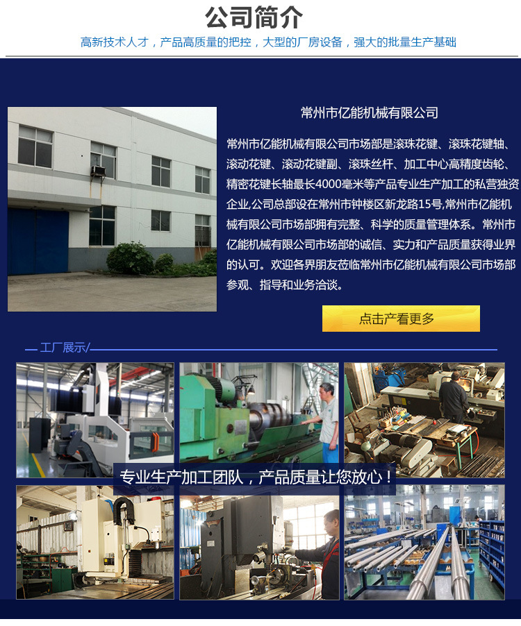 常州市億能機(jī)械有限公司市場(chǎng)部是滾珠花鍵、滾珠花鍵軸、滾動(dòng)花鍵、滾動(dòng)花鍵副、滾珠絲桿、加工中心高精度齒輪、精密花鍵長(zhǎng)軸*長(zhǎng)4000毫米等產(chǎn)品專業(yè)生產(chǎn)加工的私營(yíng)獨(dú)資企業(yè),公司總部設(shè)在常州市鐘樓區(qū)新龍路15號(hào),常州市億能機(jī)械有限公司市場(chǎng)部擁有完整、科學(xué)的質(zhì)量管理體系。常州市億能機(jī)械有限公司市場(chǎng)部的誠(chéng)信、實(shí)力和產(chǎn)品質(zhì)量獲得業(yè)界的認(rèn)可。歡迎各界朋友蒞臨常州市億能機(jī)械有限公司市場(chǎng)部參觀、指導(dǎo)和業(yè)務(wù)洽談。